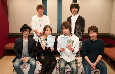 下段左より寺島拓篤(海棠蒔麻役)、皆川純子(海棠零役)、前野智昭(海棠晴役)、松岡禎丞(海棠亜樹役)
